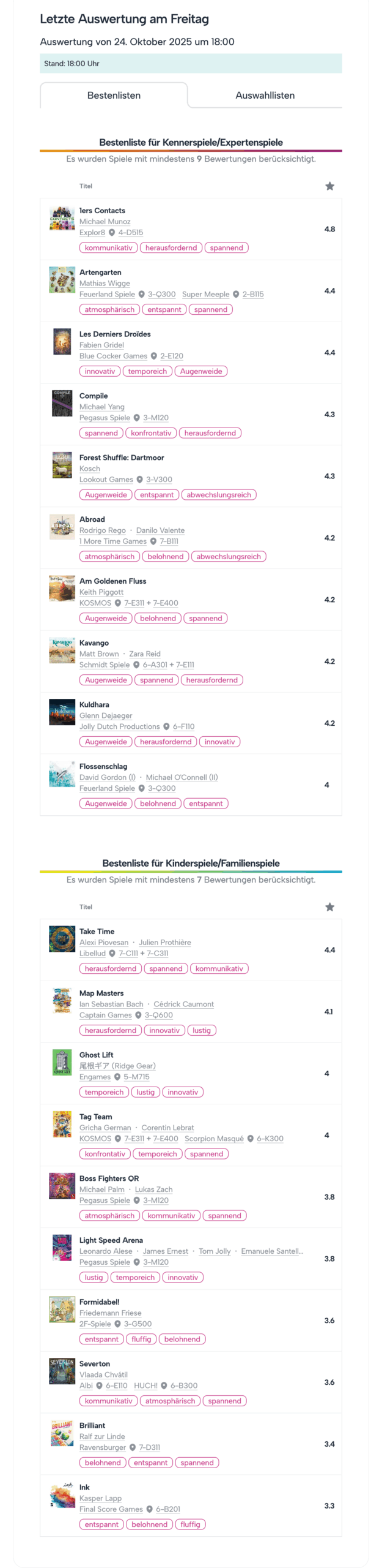 Leider fehlten uns um 18:00 Uhr noch drei Spiele, die aber um 19:00 Uhr dazugekommen sind.