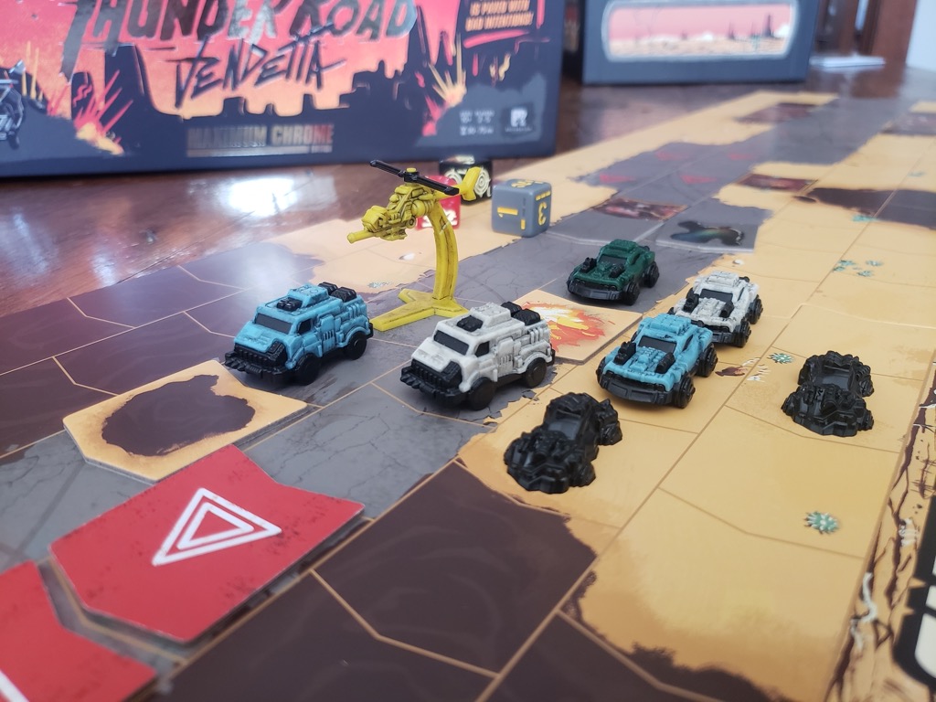 Dave Chalker, Noah Cohen, Rob Daviau, Justin D. Jacobson, Brett Myers, Brian Neff: THUNDER ROAD: VENDETTA – MAXIMUM CHROME für 2 – 6 Personen ab 10 Jahren mit Illustration von Marie Bergeron und Garrett Kaida bei Restoration Games 2023, Spieldauer 45 – 75 Minuten, Made in China